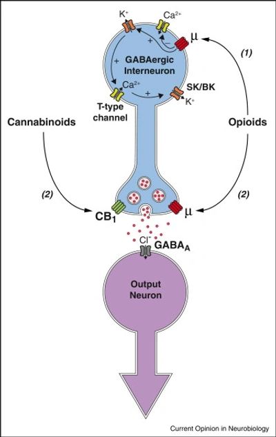 Any drug that reduces GABA will reduce the "braking" effect on the target nerves. They become disinhibited. Endorphin, and all opioid drugs, do this; they will reduce GABA activity and therefore allow the inhibited nerves to speed up. In the case of drug euphoria, the MSNs are the nerves that speed up